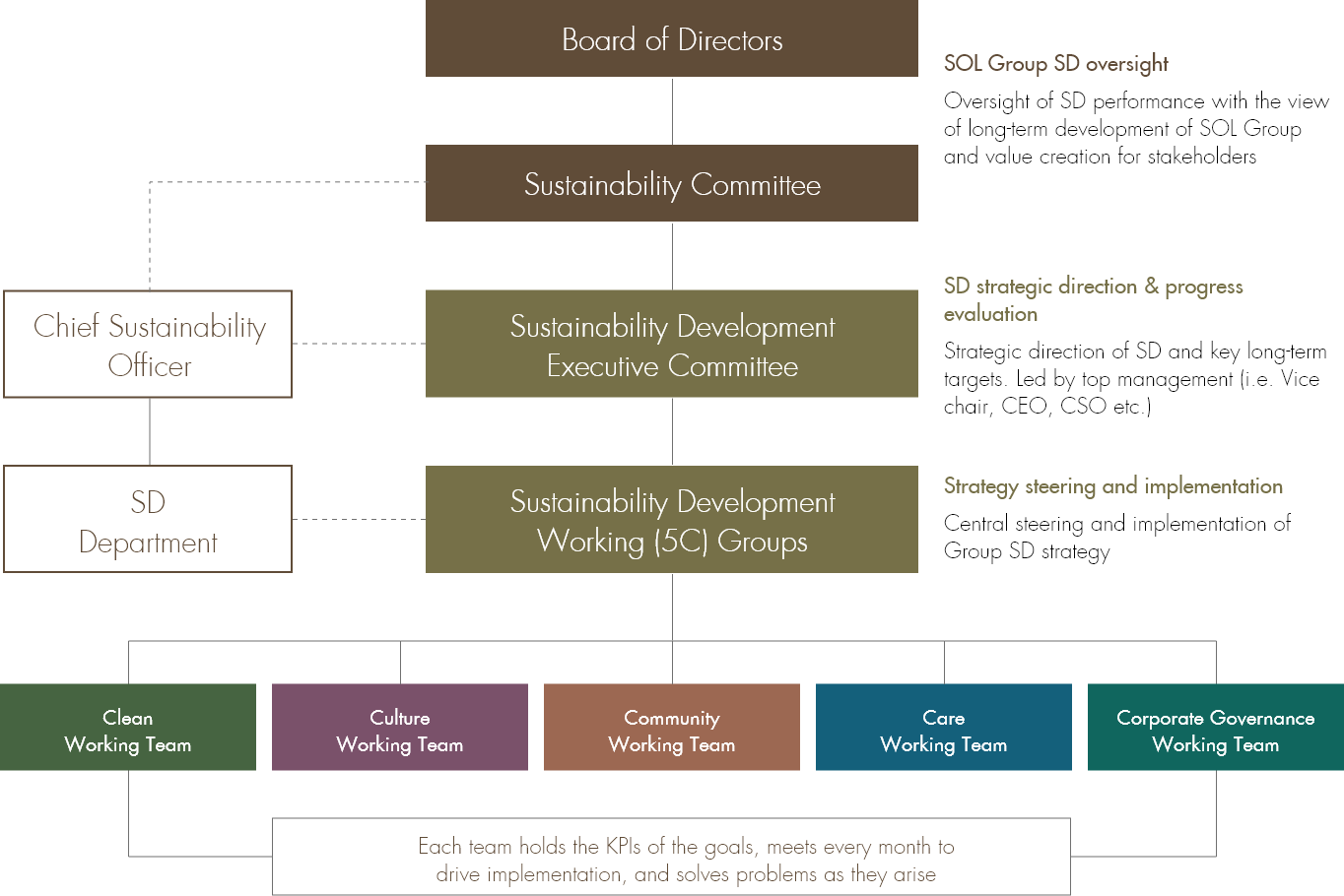 The responsibility for specific proposals and the implementation of specific goals at the operational level is delegated to five cross-departmental C Working Teams. Each team holds the KPIs of the goals, meets every month to drive implementation, and solves problems as they arise. KPIs are cascaded to relevant companies and departments for execution. The Sustainable Development Executive Committee and each C Working Team reports its progress and status to the Sustainability Committee for review on a regular basis, and the Sustainability Committee provides consolidated reports for submission to the Board of Directors.