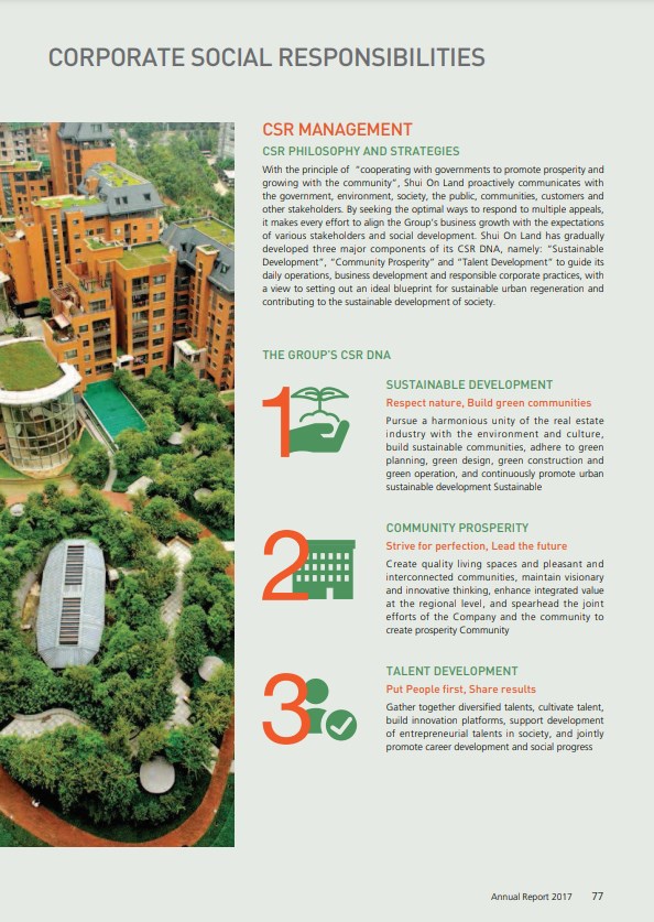 Sustainability has long been a cornerstone of Shui On Land. It touches everything we do as a business and is central to our legacy of transforming urban precincts into city landmarks in China. We are driven by our corporate vision - “To be a pioneer of sustainable premium urban communities”, and aspire to lead the sustainable transformation of China’s real estate and asset management industry. Long-term value creation can only be achieved by balancing social, environmental and economic benefits, and this ethos underpins our 5C Sustainability Strategy which guides us towards our corporate vision, unites our sustainability priorities and serves as a feedback loop to ensure that we remain focused in delivering our sustainability commitments. Through our unique capabilities to create sustainable urban communities from conception to completion, we demand ourselves to be a force for good that helps build a sustainable future for the next generations.